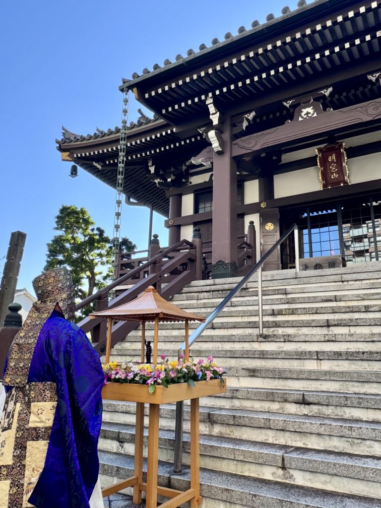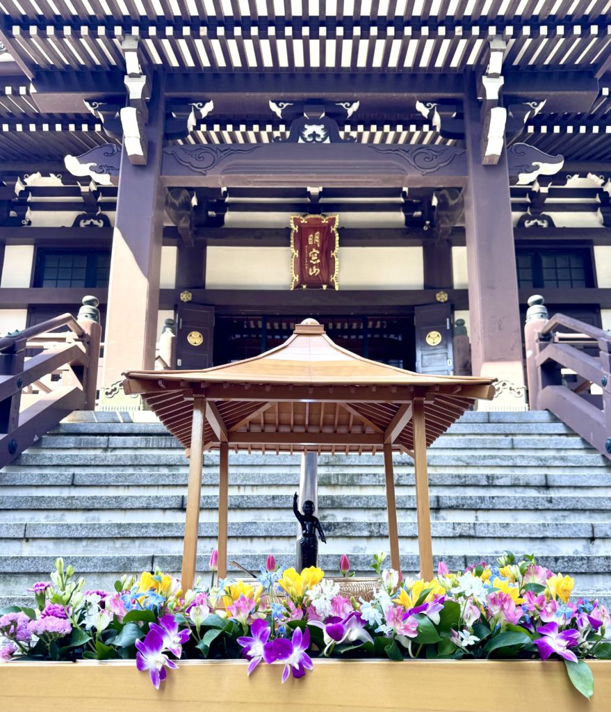 花で飾った「花御堂」に安置した誕生仏に甘茶を注ぎ、仏さまの慈悲に触れ、いのちの尊さを喜ぶご縁の日としてお参りいたします。